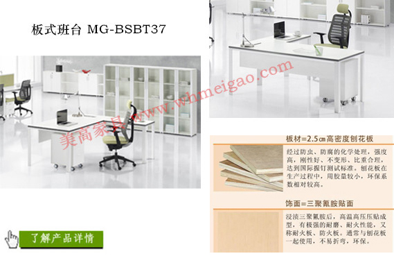板式班台MG-BSBT37,以E1级2.5cm刨花板为基材,环保健康,全自动封边设备一次成型,美观耐用,优质五金支架,超强的现代感,使用效能持久,为您打造舒适的现代办公环境。组合搭配:L形主副台+活动柜,适用于部门主管、总经理等管理层办公室。